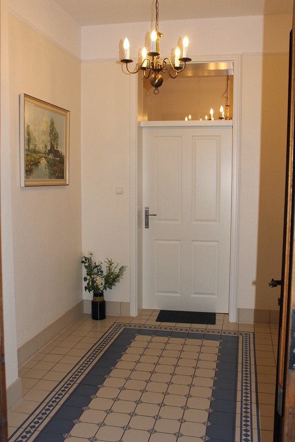 Im hinteren Teil gibt es, mit Rundumblick über die Wiesen und Pferdeweiden, eine große Ferienwohnung. Es sind 2 getrennte Schlafzimmer, ein großes Bad sowie eine idylische Terasse mit Panoramablick vorhanden. Der Wohnraum ist mit einem Kamin, einem Ausziehsofa, großer Küche und TV ausgestattet. Die Eingangstüren sowie ein altes Ölgemälde einer griechischen Göttin an der Wand sind erhalten geblieben. Mosaikfliesen unterstützen den stilvollen Charakter des Hauses.